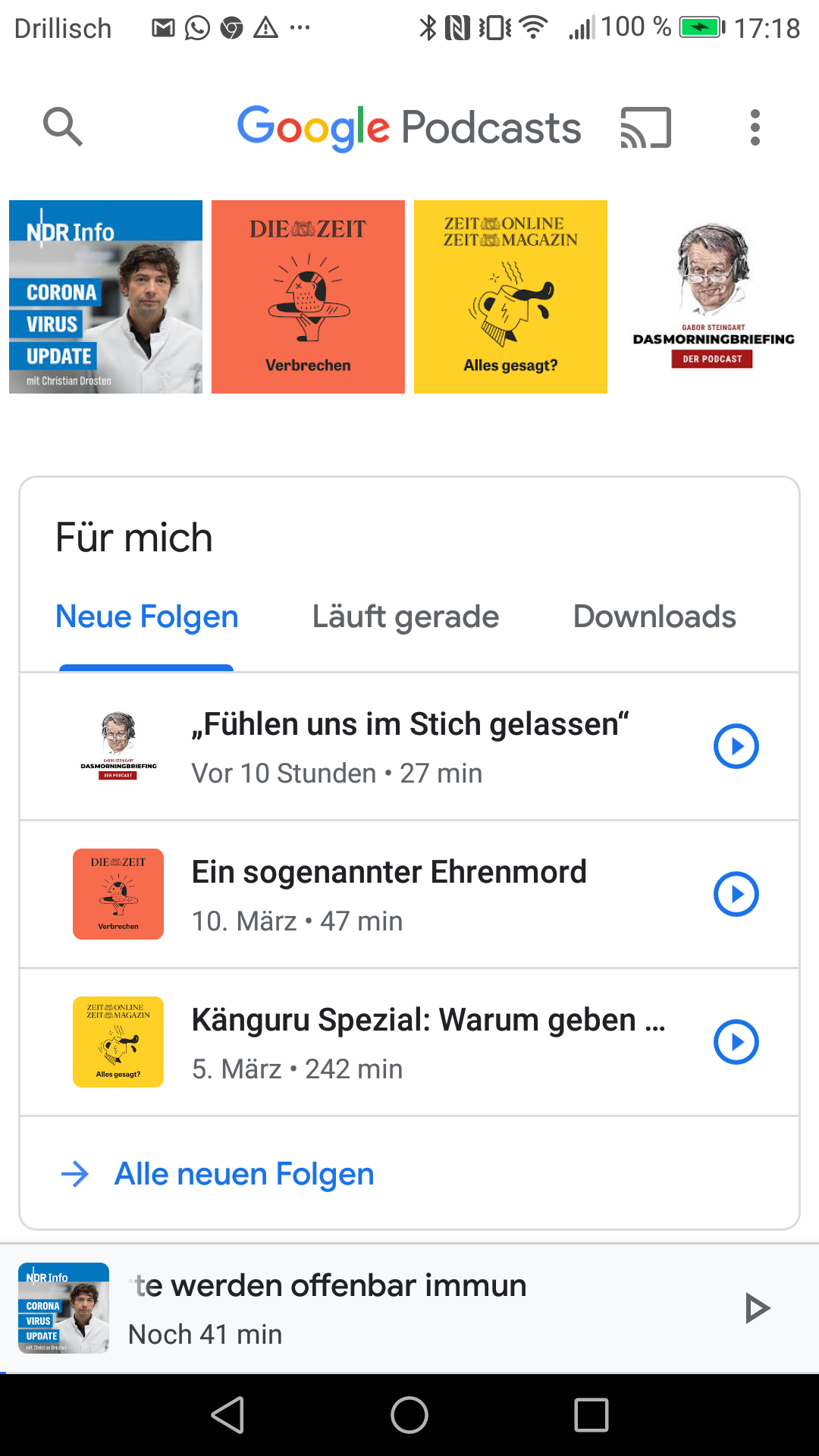 Im Google PlayStore finden sich zahlreiche Podcasts-Apps. Meine Empfehlung ist die Standard-App Google Podcasts, über die Sie eine große Anzahl an Podcasts Anbieter mit verschiedensten Podcasts Themen finden. Laden Sie sich als Erstes die App aus dem Google Play Store herunter: Google Podcasts herunterladen