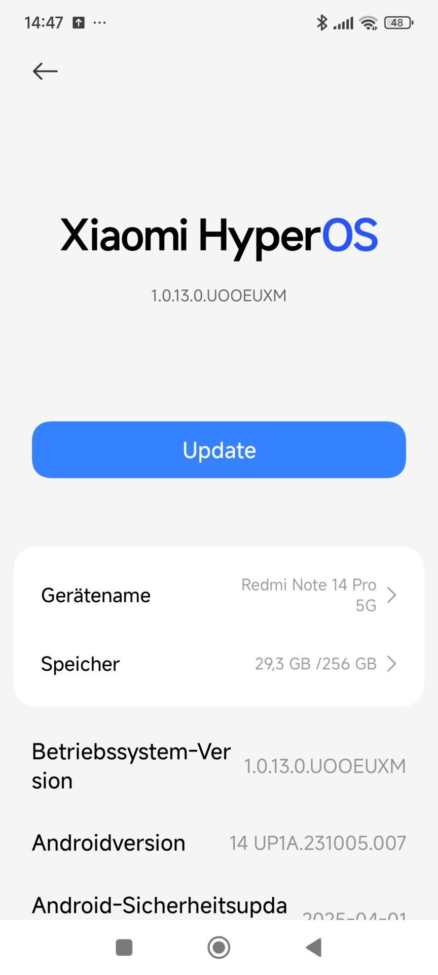 Zum Zeitpunkt des Tests (7. November 2025) arbeitet das Redmi Note 14 Pro 5G auf Android 15 Basis, mit einem Sicherheitspatch vom 1. Oktober 2025. Darüber liegt das hauseigene HyperOS in der Version 2.0.211.0.