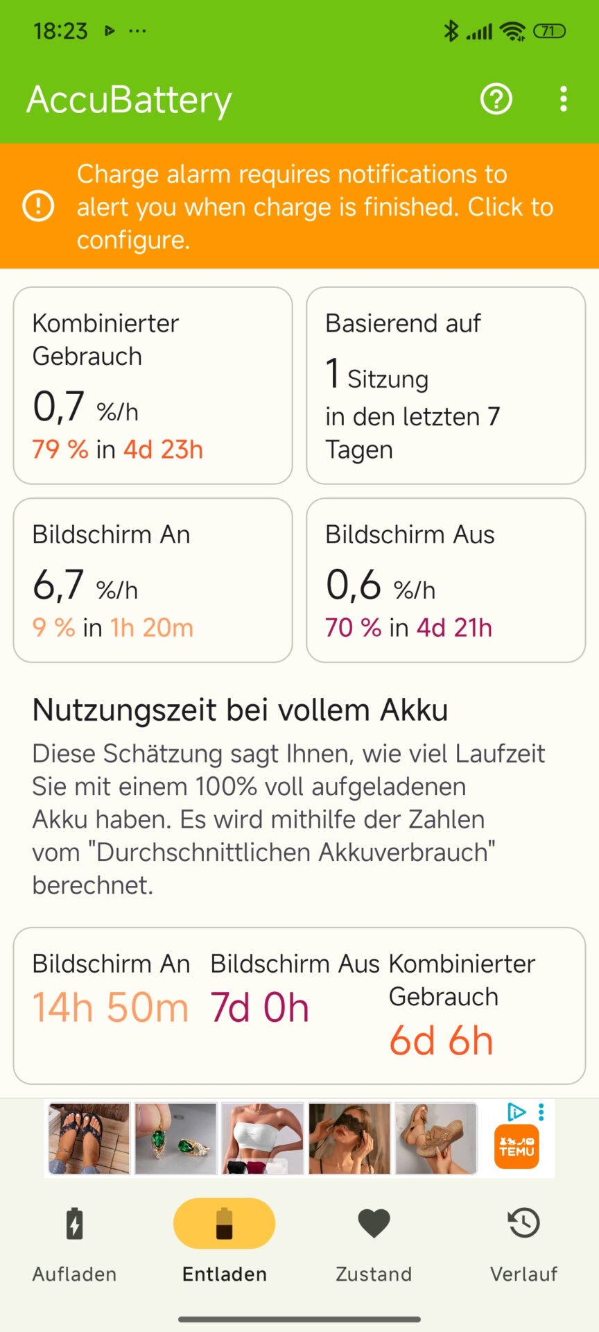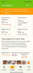 Die Screenonzeit-Messung mit AccuBattery erreicht fast 15 Stunden. Im kombinierten Verbrauch erreiche ich klar über sechs Tage, in der Nutzung als Testgerät mit adaptiver Helligkeit.